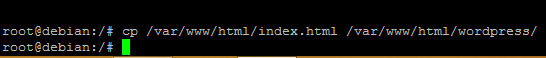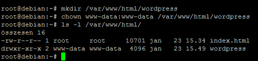 Az apache webszerver alapértelmezett html könyvtára a /var/www/html . Ebben létrehozzuk az új virtuális szerver alkönyvtárát (wordpress)! Ezt a suliban midnight commander-ben, az alábbi példában parancssorból készítjük. Az mkdir (make directory) parancs elkészíti az alkönyvtárat, a chown paranccsal beállítjuk a csoportot és tulajdonost, hogy a web-szerver hozzáférjen.