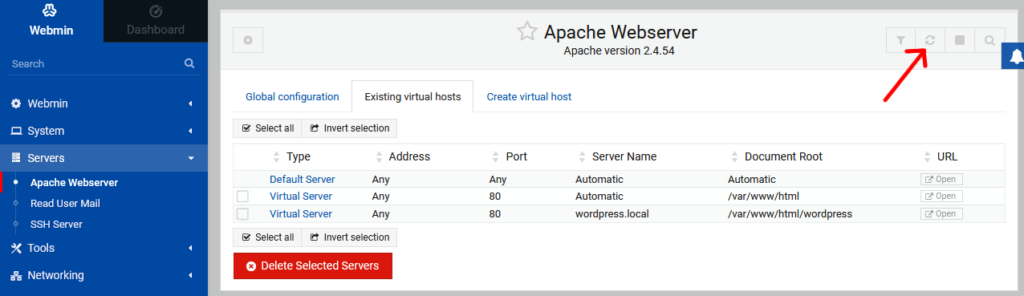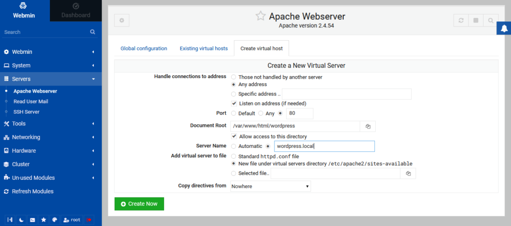 Ezután webmin-ben elkészítjük a virtuális szerver konfigurációt. A szerver a 80-as porton figyel, be kell állítani a szerver könyvtárát és nevét: