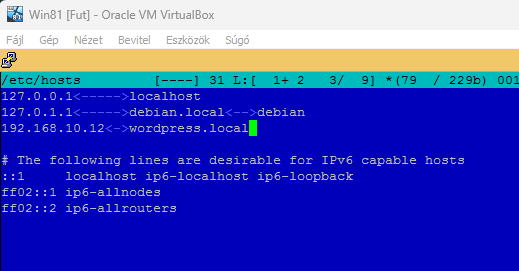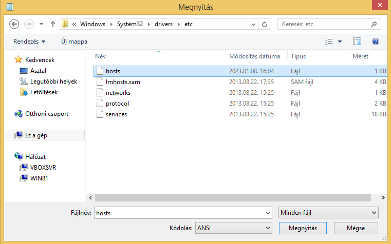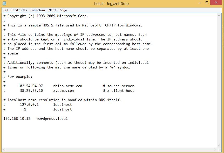Mivel nem állítottuk be a weboldalhoz nevet a DNS – szerverben, így meg kell adnunk a Windowsnak és a Linuxnak a cím-név hozzárendeléseket. Windowsban az alábbi (c:\Windows\System32\drivers\etc\hosts) fájl szerkesztésével: